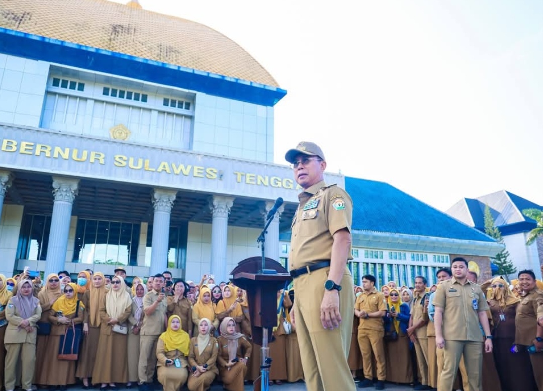 Gubernur Sulawesi Tenggara, Andi Sumangerukka, berdiri di hadapan jajaran aparatur sipil negara dengan sapaan hangat yang mencerminkan suasana penuh keakraban. Pesannya sederhana namun kuat: bekerja optimal di tengah efisiensi.