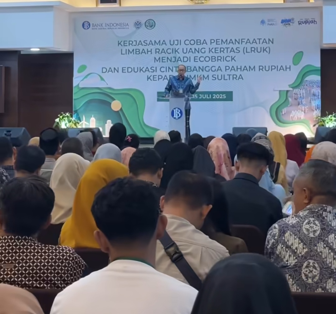 FOKUSNEWS. ID, KENDARI – Kantor Perwakilan Bank Indonesia (BI) Provinsi Sulawesi Tenggara bersama Dinas Lingkungan Hidup (DLH) Sultra menggelar kegiatan Uji Coba Pemanfaatan Limbah Racik Uang Kertas (LRUK) menjadi Ecobrick, sebagai upaya inovatif dalam mendukung pengelolaan limbah ramah lingkungan sekaligus memperkuat sinergi pemberdayaan masyarakat.
