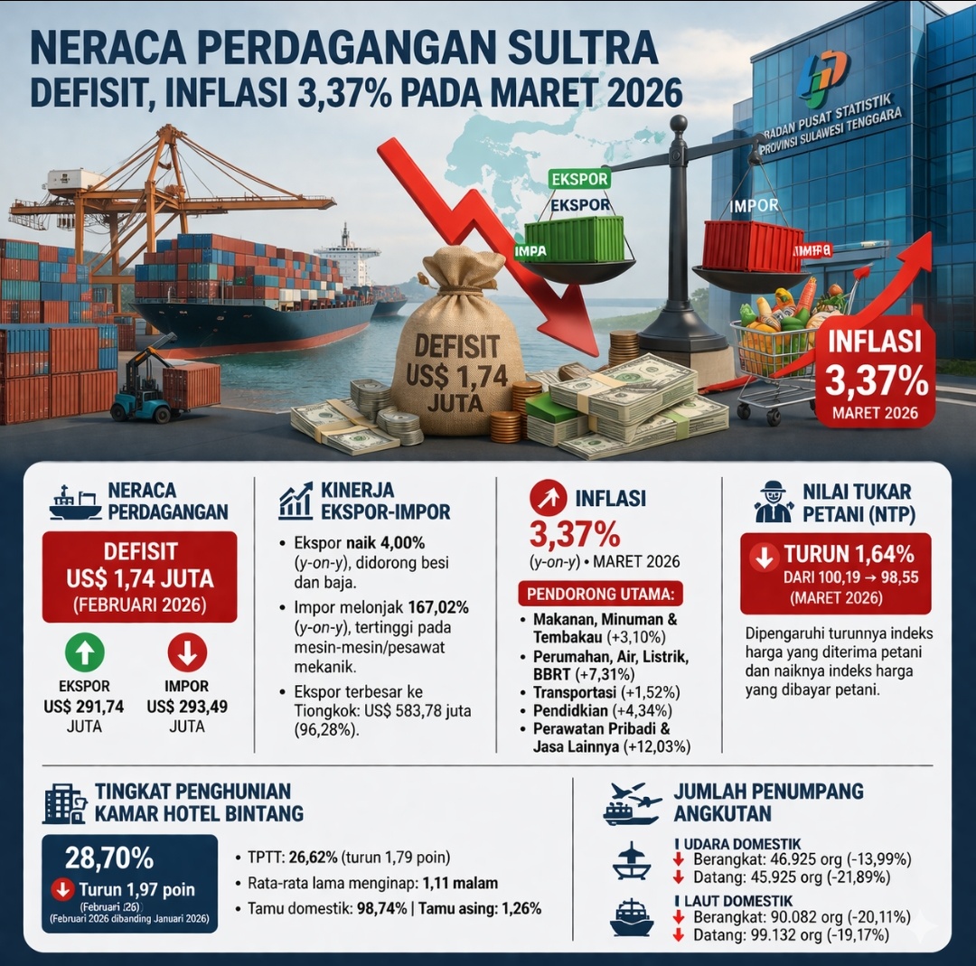 BPS Catat Neraca Perdagangan Sultra Defisit, Inflasi Maret 2026 Capai 3,37 Persen