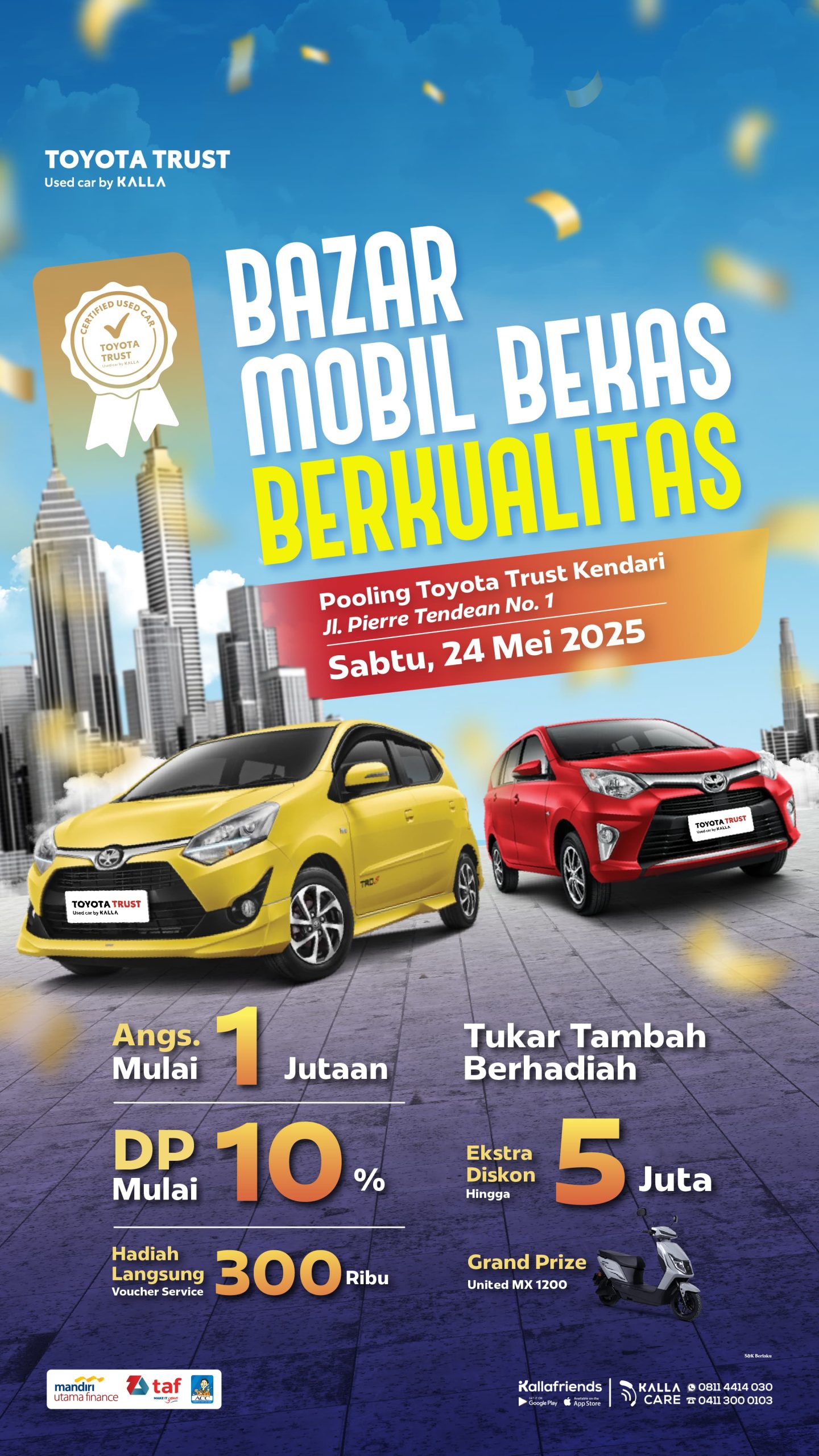 FOKUSNEWS.ID, KENDARI – Toyota Trust Kendari, bagian dari Hadji Kalla Toyota, menggelar event bazar mobil bekas berkualitas pada Sabtu, 24 Mei 2025. Kegiatan ini bertujuan untuk mensosialisasikan layanan penjualan mobil bekas berkualitas serta fasilitas tukar tambah kendaraan kepada masyarakat Kota Kendari.