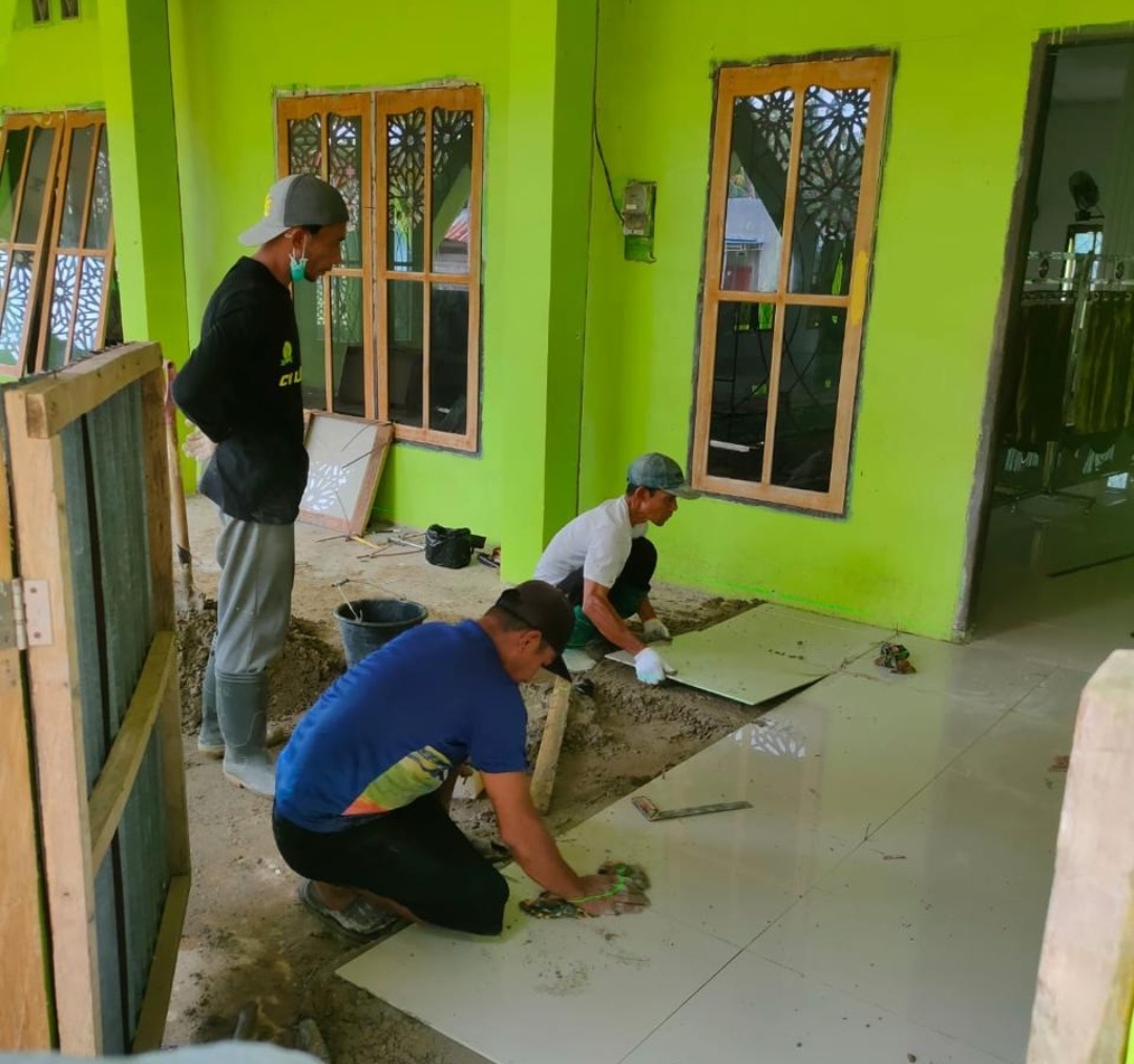 Pekerja melakukan pemasangan keramik lantai dalam kegiatan renovasi masjid di salah satu wilayah sekitar operasional PT DSSP Power Kendari. Renovasi ini merupakan bagian dari program CSR perusahaan guna meningkatkan kenyamanan masyarakat dalam beribadah selama bulan suci Ramadan.(Foto Ist)