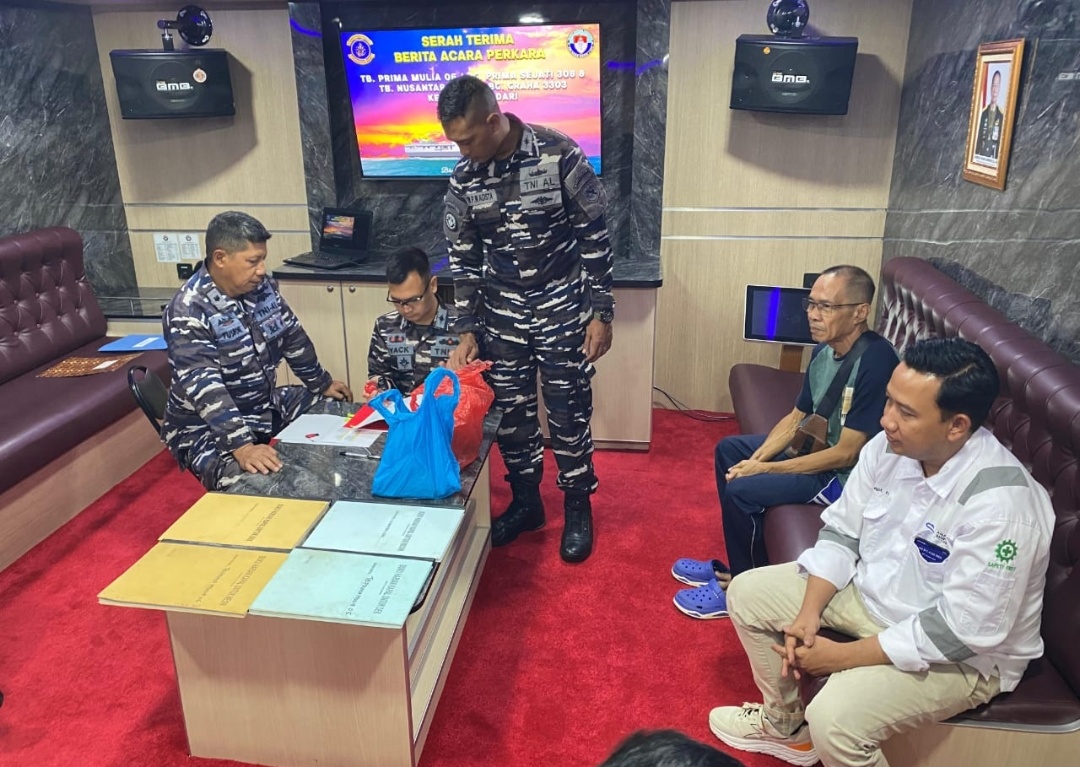 Personel Lanal Kendari melakukan proses serah terima Berita Acara Perkara terkait penindakan dua kapal tunda dan tongkang hasil operasi KRI Bung Hatta-370 (Foto Ist)