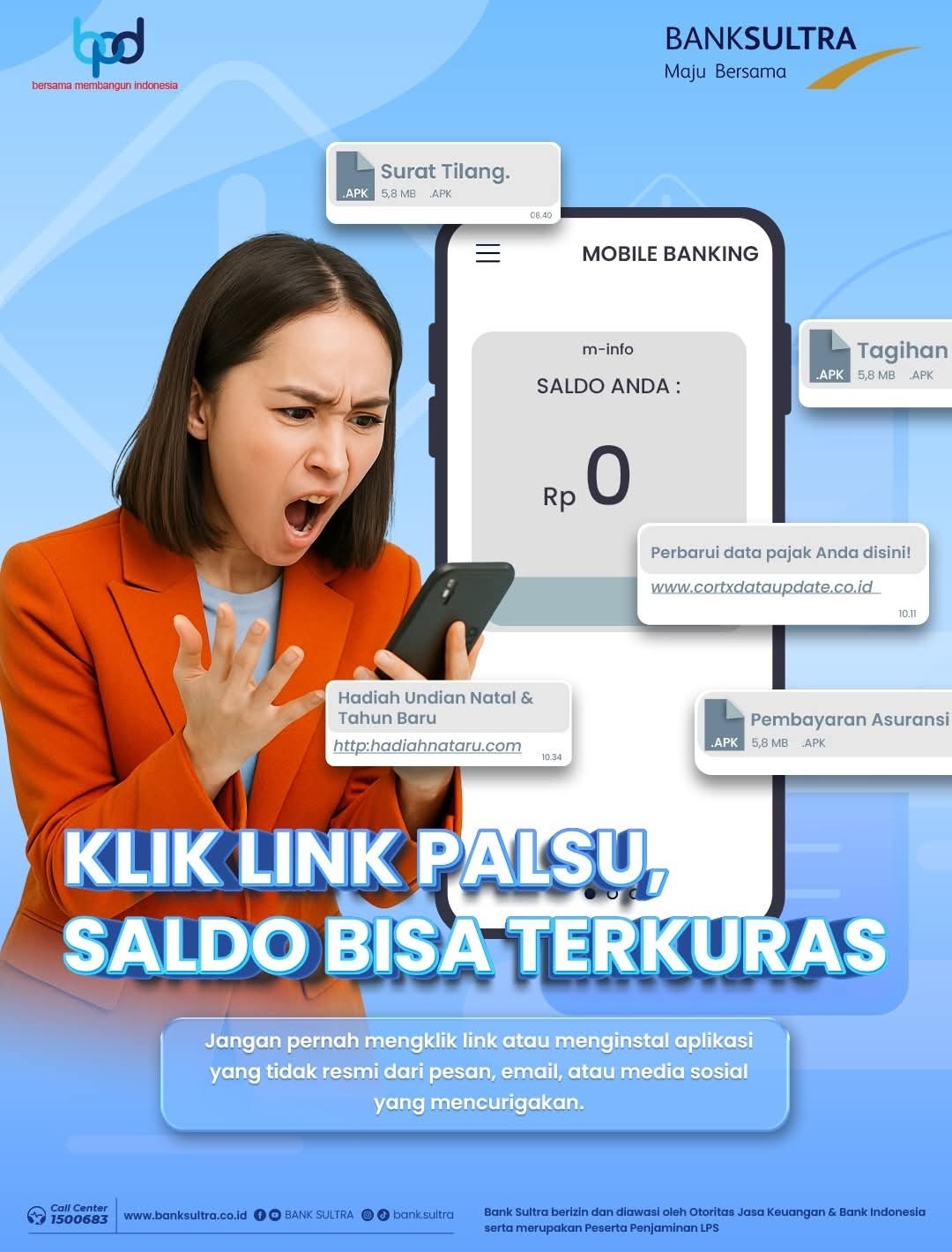 “Keamanan dana dan data nasabah adalah prioritas utama Bank Sultra. Kami menegaskan bahwa Bank Sultra tidak pernah meminta data rahasia seperti PIN, Password, Kode OTP, atau meminta nasabah mengunduh aplikasi di luar Play Store/App Store resmi melalui pesan pribadi.”