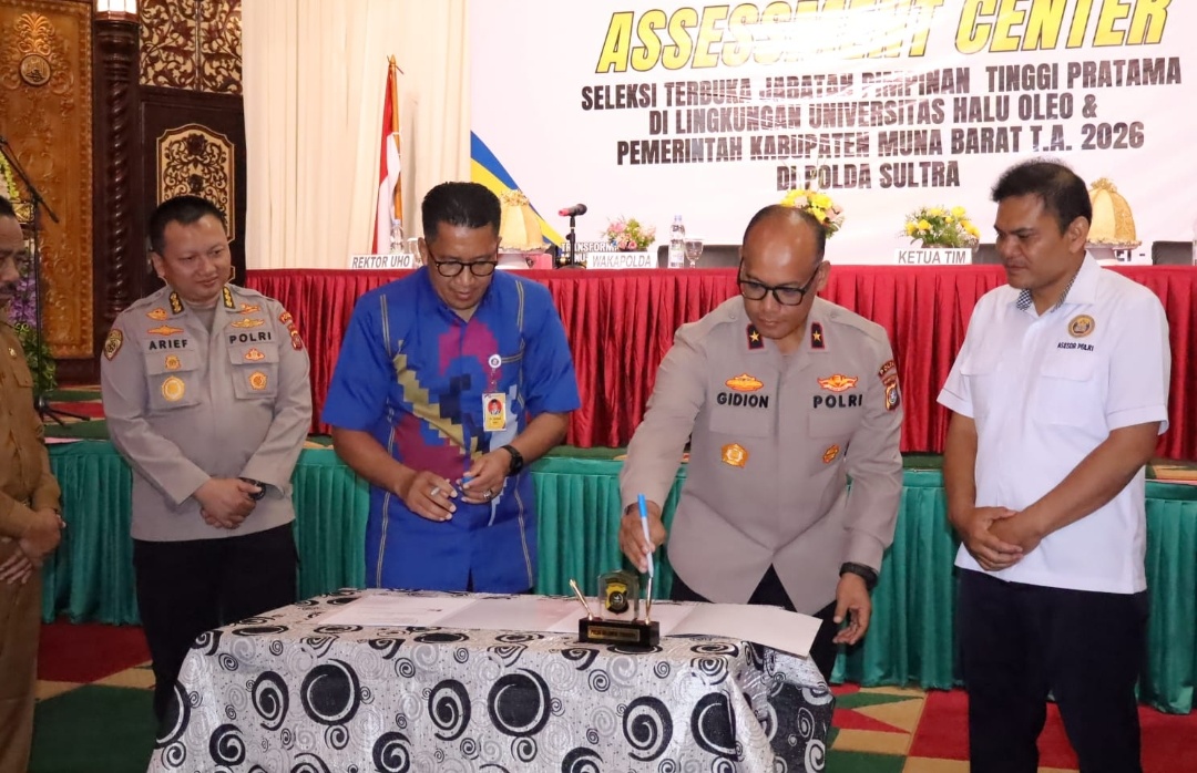 FOKUSNEWS.ID, KENDARI – Polda Sulawesi Tenggara melalui Biro Sumber Daya Manusia (SDM) menjalin kerja sama dengan Universitas Halu Oleo (UHO) Kendari dalam pelaksanaan Assessment Center Polri. Penandatanganan kerja sama tersebut berlangsung di Hotel Qubah 9, Kota Kendari, Selasa (31/3/2026) pagi.