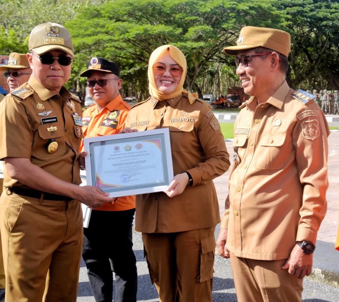 FOKUSNEWS .ID, KENDARI – Pemerintah Kota Kendari kembali menorehkan prestasi dalam upaya memperkuat mitigasi bencana. Pada Apel Siaga dan Simulasi Bencana Gempa Bumi dan Tsunami dalam rangka Jambore Tangguh Bencana Provinsi Sulawesi Tenggara (Sultra) Tahun 2025, Wali Kota Kendari, dr. Hj. Siska Karina Imran, SKM, menerima langsung Piagam Penghargaan dari Gubernur Sulawesi Tenggara atas keberhasilan Kota Kendari membentuk Desa Tangguh Bencana, Senin (24/11/2025).